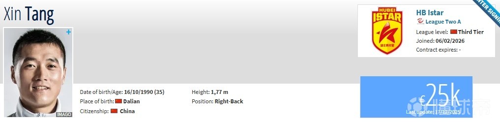 北京时间2月7日,德转更新,35岁原成都蓉城后卫唐鑫加盟湖北青年星。